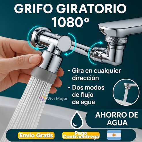 Alcanza fácilmente cada esquina del fregadero con una rotación completa de 1080°, perfecta para lavarte la cara, enjuagar platos o limpiar el fregadero.
